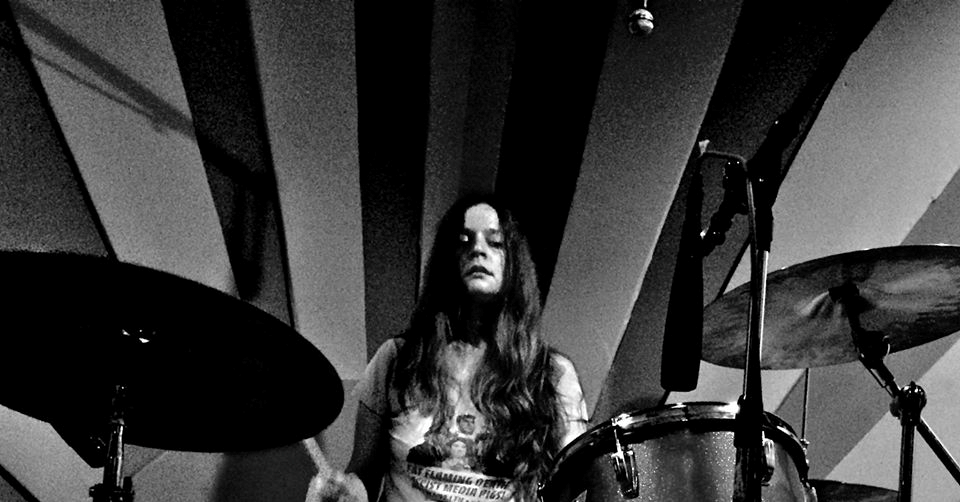 Meg playing drums, taken from Heron Oblivion Facebook page