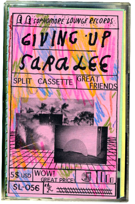 Both sides of this split cassette from the reliable Sophomore Lounge label hold intrigue, but I find myself returning to the Sara Lee side more reliably. I just happened to look up The No Nos on Spotify last week and maybe that’s the reason I’m equating luscious Mrs. Lee to that classic Pac-Northwest band, but my ample gut’s telling me there’s a similar lilt to the vocals and riffs. Love the fuzz that clings to the guitars like pollin to a windowpane, and I wouldn’t want to scrape it off if I could. Giving Up pack a more explosive sound and will likely appease a higher percentage of the masses. Jesus, I’m at a loss here. Superdrag? Shit this is pretty poppy and powerful and ppplayful in its own way, and a lot louder too, the bass rumbling my record room, if you play one side then the other, as I just did. And will again. Find this, listen to it once like you’ve never listened before, then bury it for 20 years, dig it up, and listen to it again in your antique Walkman and FREAK THE FUCK OUT. Or not; just sounded like a cool gesture there for a second… Truly one of those rare split-tape couplings that seems ordained by heaven.