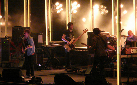 Liars came on promptly at 7:30. The amphitheater was still more or less empty, but that didn’t stop the band from turning in a cracker performance. As Angus Andrews prowled about the stage, his massive hands waving about in a blur, the freezing crowd danced along, desperate to find a beat to warm up to. Highlights of the 45-minute set included “Plaster Casts of Everything” and “Houseclouds.” The guys on my left had never heard Liars nor did it seem many of the others who responded with polite applause. It is easy to forget just how mainstream Radiohead is, even though they manage to defy expectations with each and every release.