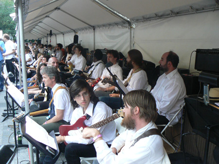 First came the world premier of composer Rhys Chatham's A Crimson Grail for 200 Electric Guitars, a massive piece in three shimmering movements and its orchestration of 200 electric guitars, 16 basses, and one hi-hat. Rather than creating a blaring, dense wall of noise, Chatham's guitar orchestra was a shifting, sparkling ocean of tonality. Chords rose and fell, meshed and crystallized, and ultimately congealed into a vibrating, magical marriage of dissonance and harmony, multiplicity and unity. The 217 players (a few TMTers included) weren't a raging army of axe-wielders, but smaller and subtler parts of a larger collective instrument. From the bandshell stage, Chatham lead the impressive affair with the help of four section leaders perched atop platforms in the crowd. Trying to decipher just how he was guiding the piece was tempting, but closing one’s eyes and letting the vibrations take over provided much more satisfaction.