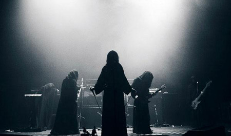 It was in eager, nerve-tingling anticipation that I approached SunnO)))’s first New York appearance in roughly two years. A special four date scuttlebutt (two shows on the East Coast, two on the West) would see the band without a new album to promote, instead celebrating the ten year anniversary of the now legendary Grimm Robe Demos, their first recorded output. Like that demo, the initial testament to their unending down-tuned drone worship, their performance at the Knit was filled with intestine-churning glory. Though more recent SunnO))) live shows have hosted up to seven members on stage, they began with just two robed specters, Southern Lord label-head Greg Anderson and the inimitable Steven O’Malley (KTL, Burning Witch). That’s how it would also be this night, and in the end, less was indeed more.