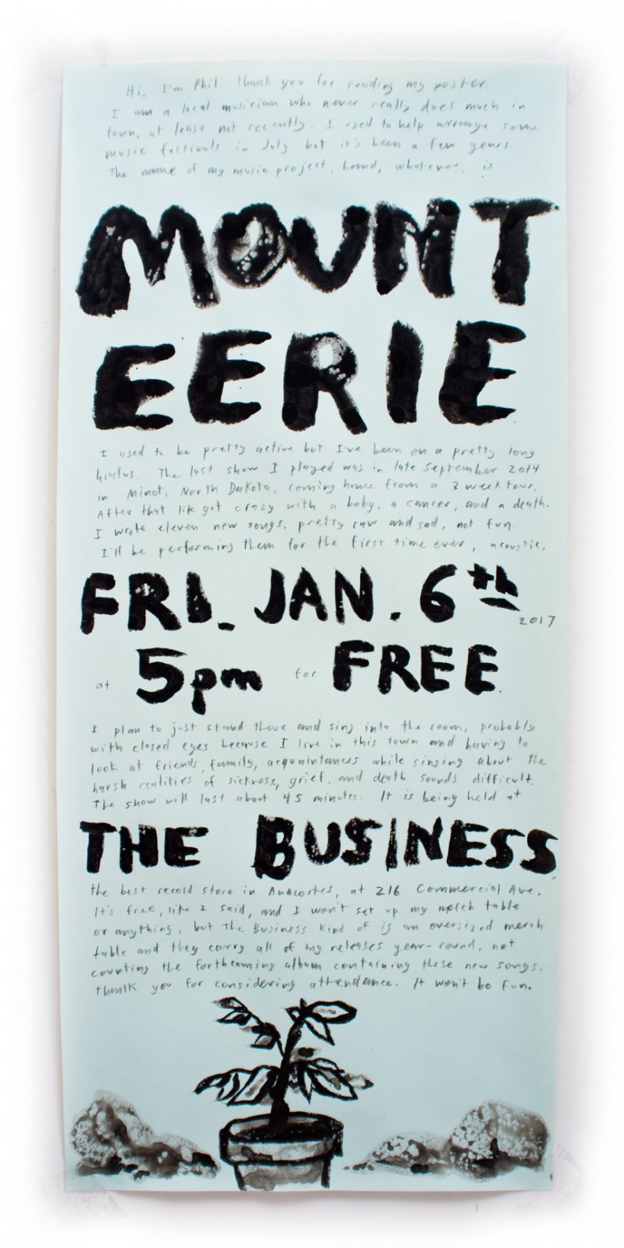 In another poster, Elverum writes, “I plan to just stand there and sing into the room, probably with closed eyes because I live in this town and having to look at friends, family, acquaintances while singing about the harsh realities of sickness, grief, and death sounds difficult.”