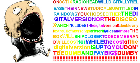 That's 10 days from now. Normally that kind of secret would be impossible to keep because of the astronomical amount of fake time between recording and release, but there's no label around to slow the process down artificially. Radiohead mark the first for a band of this magnitude to forgo the label and distribution process entirely to record, produce, and deliver the music on their terms. Well, that's not true. Radiohead are delivering the album on your terms. You decide how much to pay. I'm not shitting you, the digital copy of the album can be downloaded for any price; they said so themselves. What kind of fan service is that?