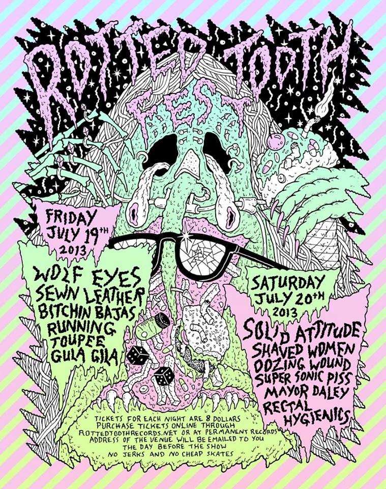Rotted Tooth Fest features acts such as Wolf Eyes, Bitchin’ Bajas, Oozing Wound, Sewn Leather, and a multitude of other sweaty, noisy folks who are looking to massage your aching free will if you’ll just let them. (One of the other bands on the bill is Rectal Hygienics, which is a name I wish I had called dibs on earlier.)